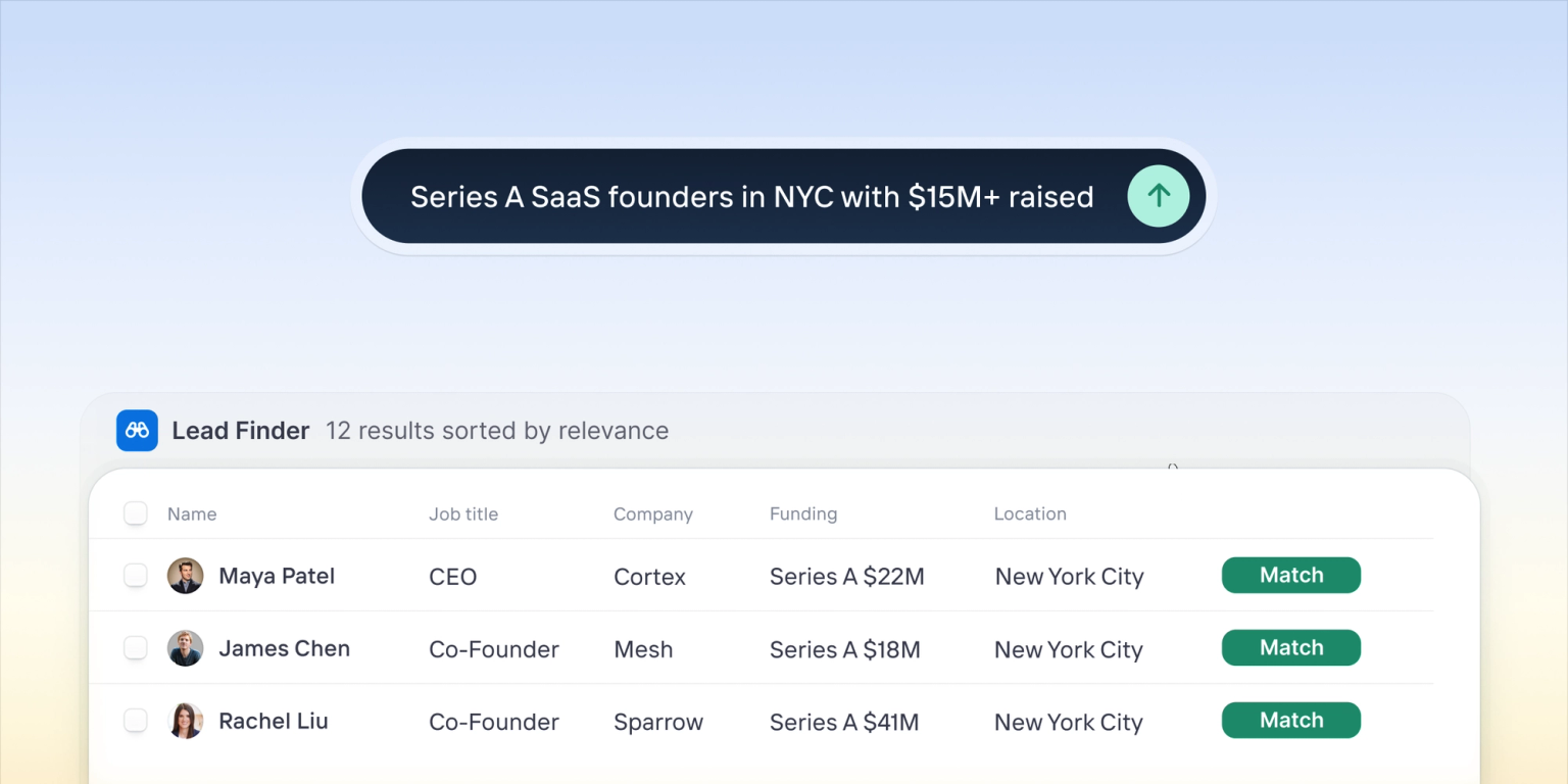 Lead Finder gives you access to Clarify's enriched database of companies and people. Describe who you're looking for — role, industry, location, funding stage — and it returns a ranked list of matches. Results include company data, job titles, and LinkedIn URLs. Email addresses are included when you import.